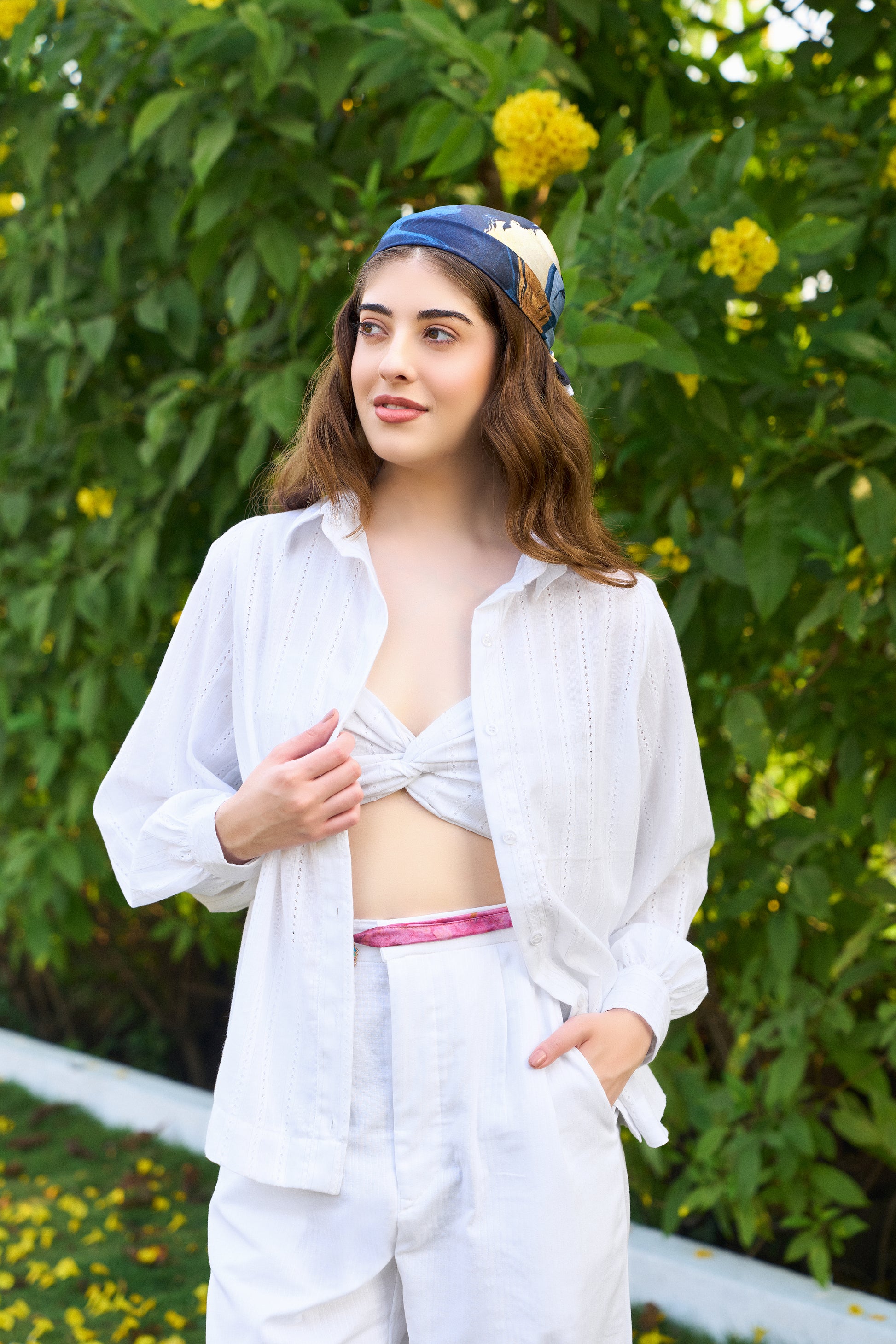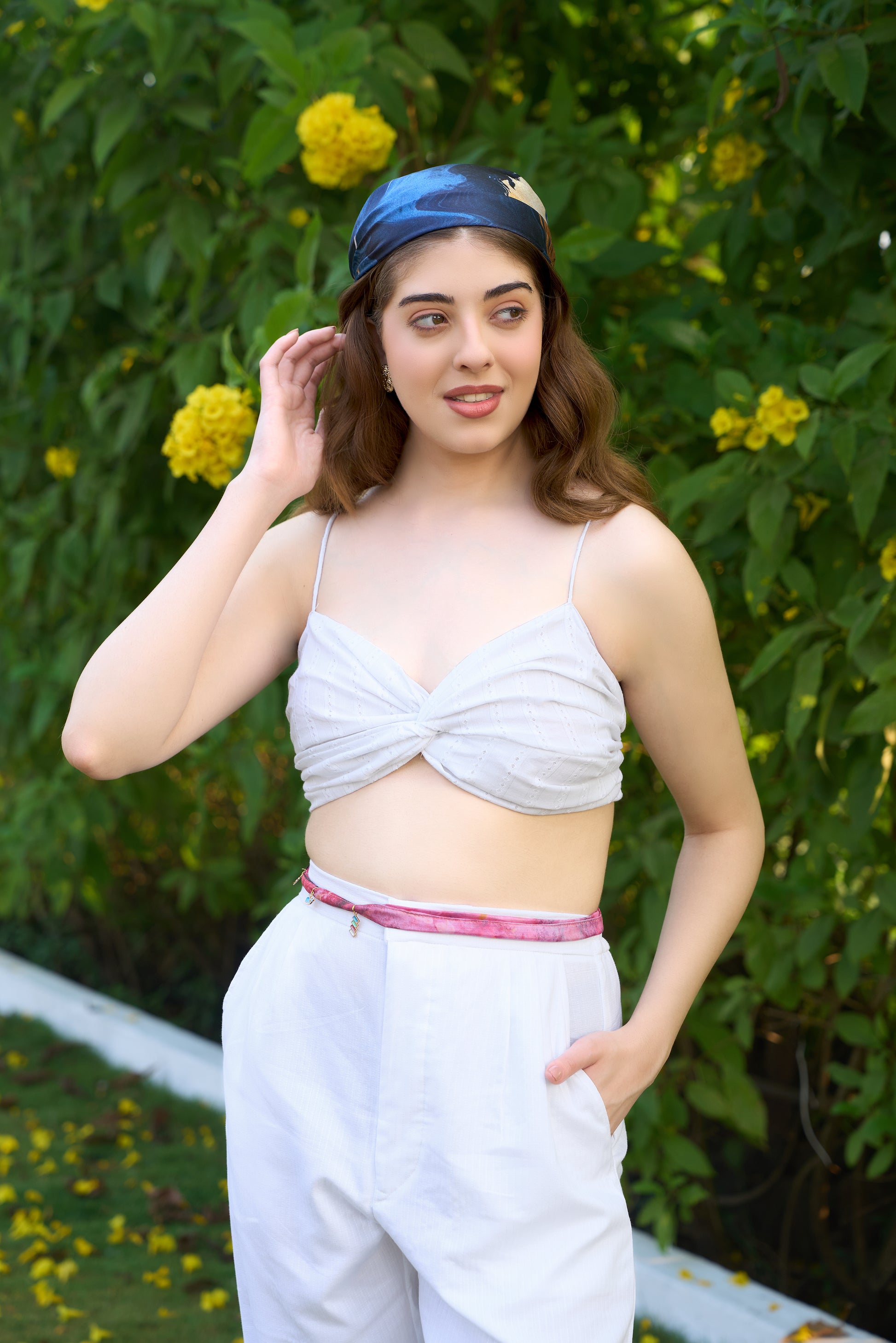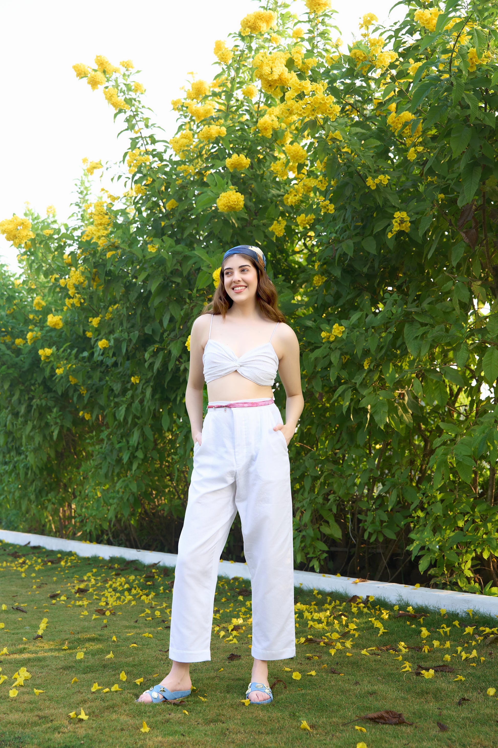 The bralette is detailed with a twist-front design and delicate shoulder straps, adding a feminine touch to the minimal look. The high-waisted pants balance the cropped top with a relaxed fit, making the set perfect for resort wear, vacations, or laid-back summer outings.