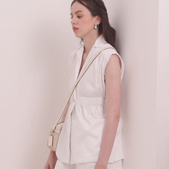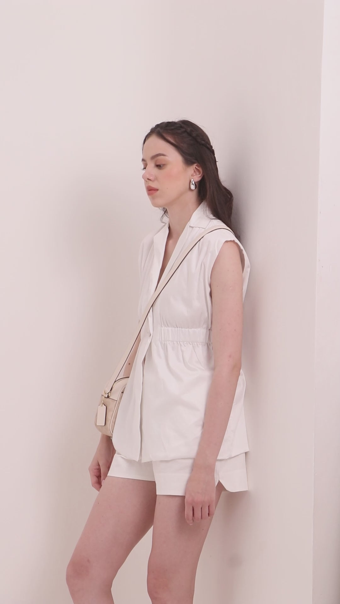 The structured jacket top features cap sleeves and buttoned details, creating a tailored, versatile silhouette. Paired with coordinating shorts, this sleek set offers a contemporary, chic look perfect for casual occasions.