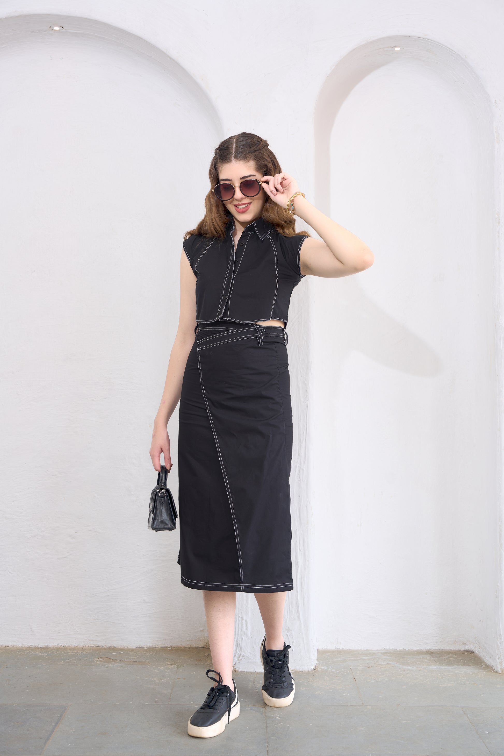 The sleeveless crop top is detailed with visible white stitch lines that add definition and a subtle statement, while the high-waisted A-line skirt creates effortless movement and ease. Designed for versatility, the Moana Top transitions seamlessly from casual daytime outings to elevated evening looks.