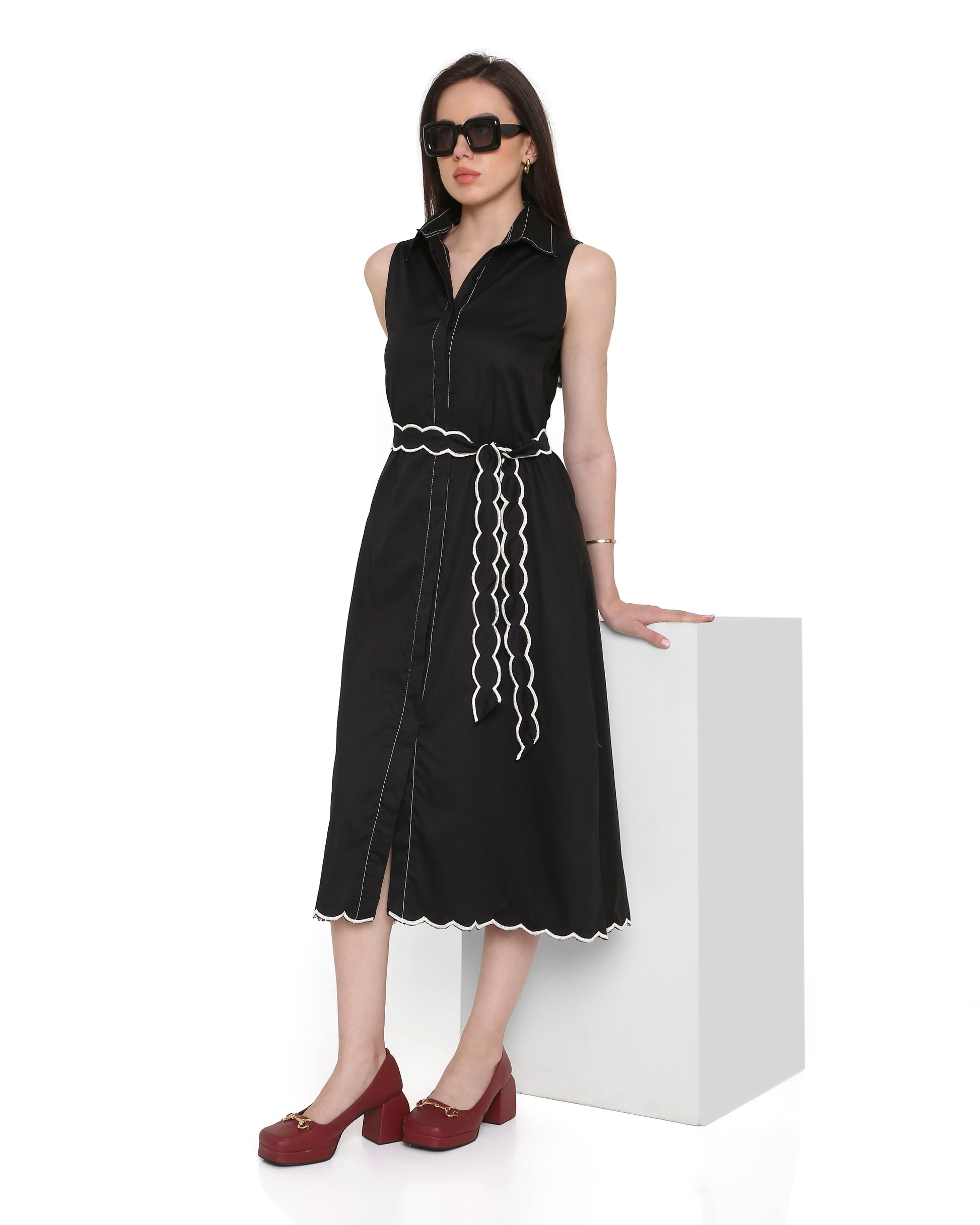 The design is finished with a scallop-detailed hemline and a matching embroidered belt, gently cinching the waist to create a flattering, feminine shape. A classic collared neckline and button-down front lend a polished, shirt-dress appeal, while the midi length keeps the look timeless and versatile.